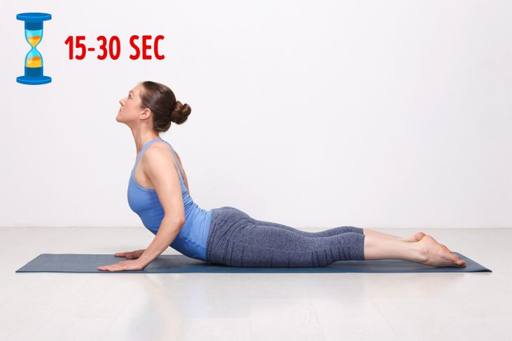 Na macie połóż się na brzuchu, ustawiając dłonie pod barkami na ziemi. Podczas wdechu podnieś swoje tułowie. Twoje ramiona muszą być wtedy proste. Podczas tworzenia łuku twój tułów musi się lekko odchylić to tyłu. Staraj się wyciągnąć głowę jak najwyżej. W takiej pozycji pozostań przez 15 sekund.