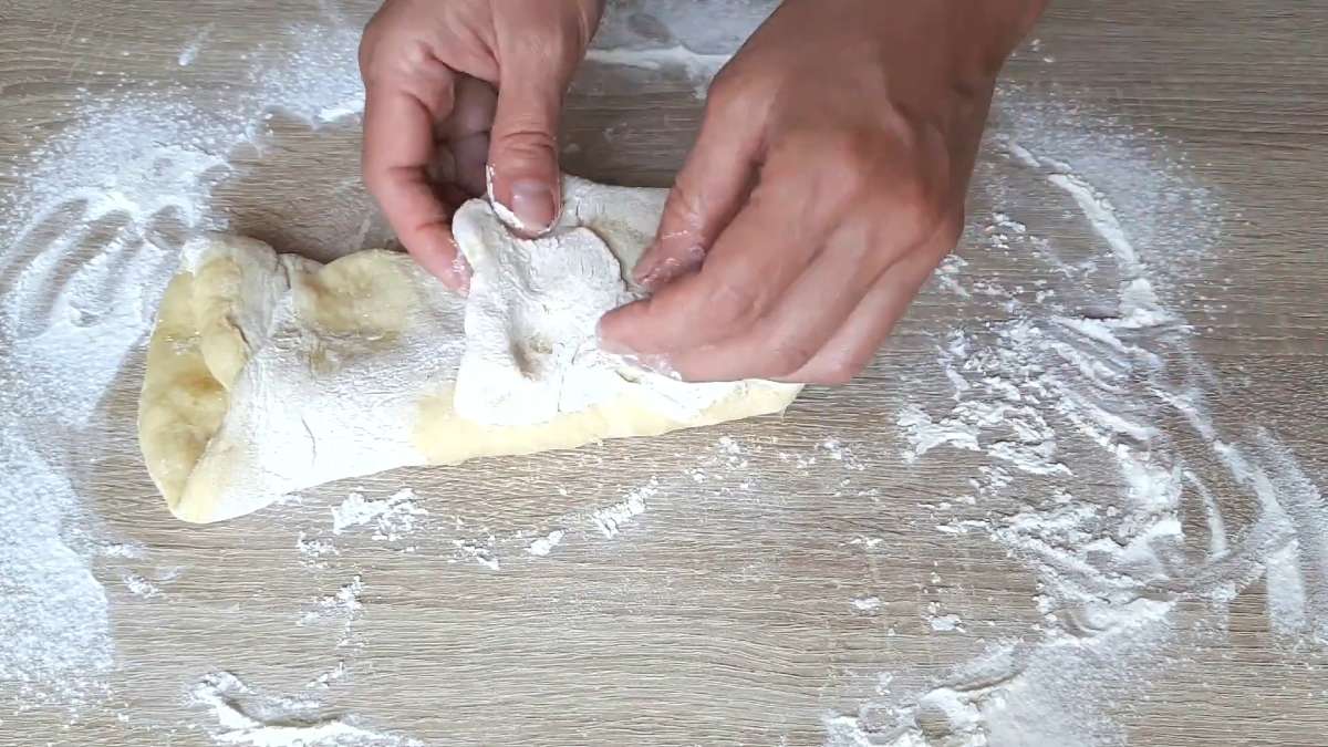5.Rozwałkowane ciasto pokrój na paski na szerokość 5 cm, następnie zrób na środku nacięcie i krawędzie obróć do środka nacięcia. Blachę wyłóż papierem od pieczenia i układaj na nim przygotowane ciastka, które przykryj jeszcze ręcznikiem na około 15 minut.