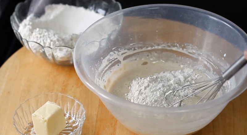 1.Do miski wlej ciepłe mleko, następnie wysp suche drożdże, następnie dodaj łyżkę cukru i 2 łyżki mąki, całość dokładnie wymieszaj. Połóż na bok , wtedy zaczyn urośnie.