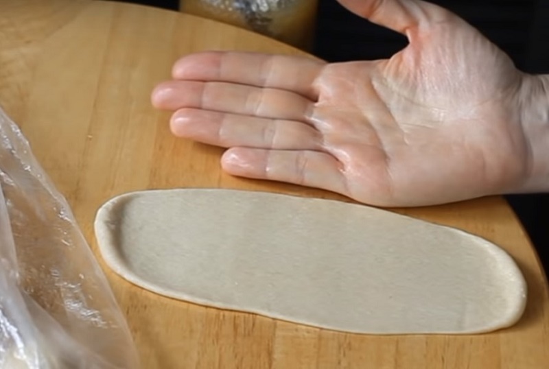 5.Po upływie tego czasu z każdego kawałka uformuj kulkę, następnie rozwałkuj ją , aby była dłuższa niż Twoja dłoń (postępuj tak jak jest pokazana na zdjęciu poniżej).