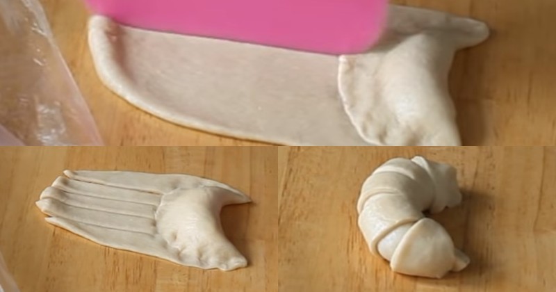 7.Na pozostałym kawałku zrób cięcia , następnie tymi paskami owiń w koło część ciasta z nadzieniem.