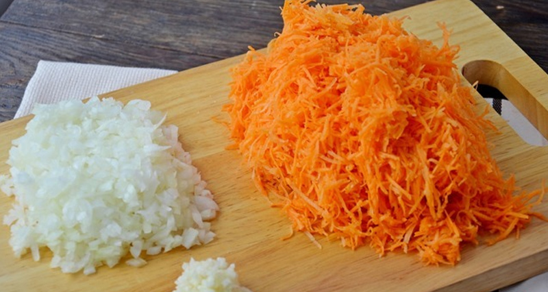 1. Należy obrać warzywa, a następnie umyć je pod bieżącą wodą. Cebulę drobno pokroić, a marchewki zetrzeć na tarce o grubych oczkach.