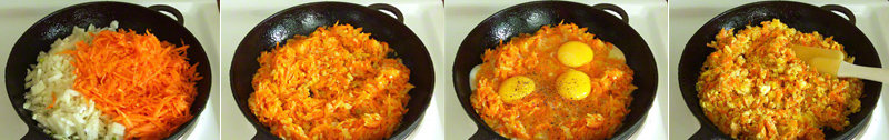 3. Gdy marchewki zmiękną, należy dodać surowe jajka. Posolić i dodać pieprzu wedle uznania, a następnie smażyć na małym ogniu przez kolejne 5 minut. Podczas smażenia cały czas mieszać.