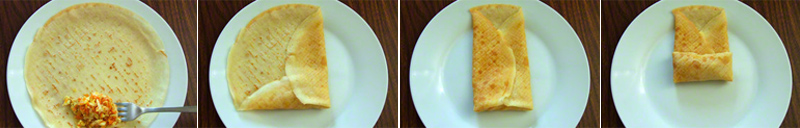 6. Na koniec usmażyć naleśniki według swojego ulubionego i sprawdzonego przepisu. Porcję farszu należy umieścić na krawędzi każdego naleśnika (1-2 łyżki), a następnie zawinąć go w kopertę.