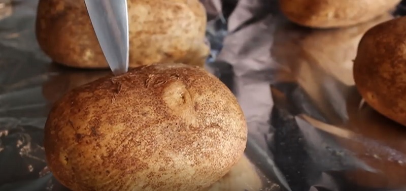 4. Wyciągnij ziemniaki z piekarnika i sprawdź gotowość, używając noża – powinien łatwo wbić się w ziemniaka.