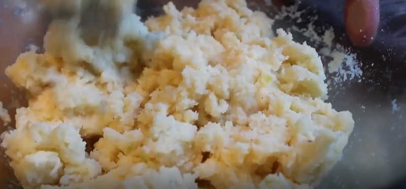 6. Wymieszaj ziemniaki z twardym, tartym serem, podsmażoną cebulką, jajkiem i szynką.