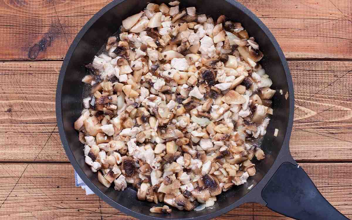 3.Na rozgrzanej patelni z dodatkiem oleju podsmaż umyte oraz w kosteczkę pokrojone pieczarki.