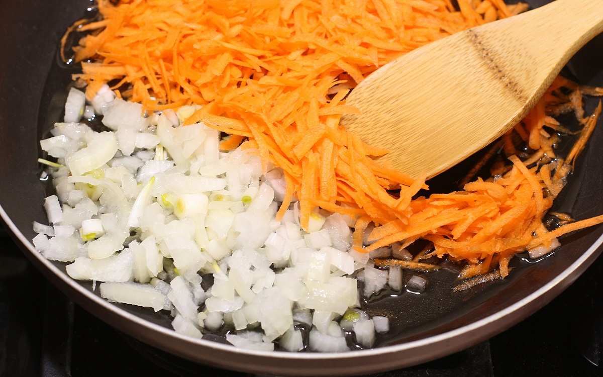 4.Osobno na rozgrzanej patelni z dodatkiem oleju podsmaż posiekaną drobno cebulę oraz marchew startą na grubych oczkach na tarce.