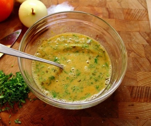 1. Do miski wbij jajka i wlej mleko. Dodaj sól, cukier, pieprz i przyprawy. Roztrzep widelcem jajka, mieszając je z przyprawami.