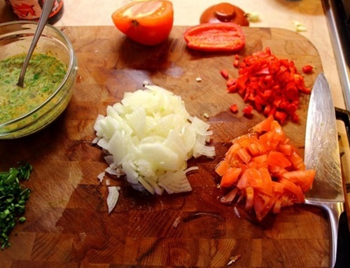 2. Pokrój cebulę, pomidora i paprykę na małe kostki.