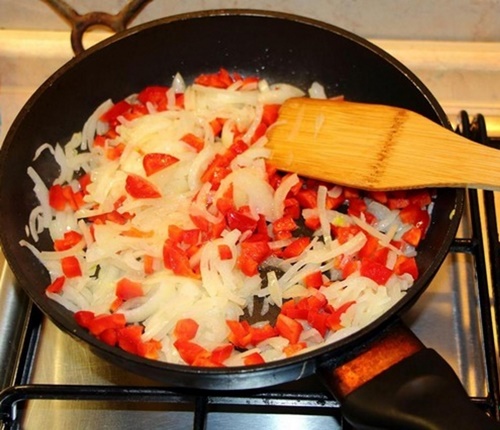 3. Podsmaż cebulę z pieprzem na dużym ogniu, ciągle mieszając.