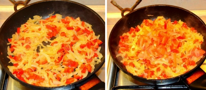 4. W chwili, gdy cebula zaczyna się rumienić, dodaj pokrojonego pomidora i paprykę.