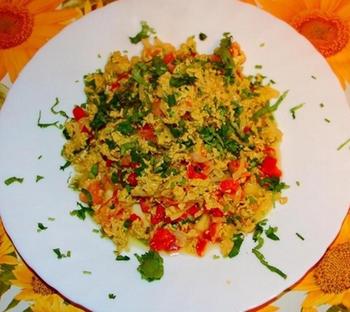 7. Pozostaje tylko przełożyć na talerze posypać posiekaną kolendrą. Prawdziwa pyszna gruzińska jajecznica gotowa.