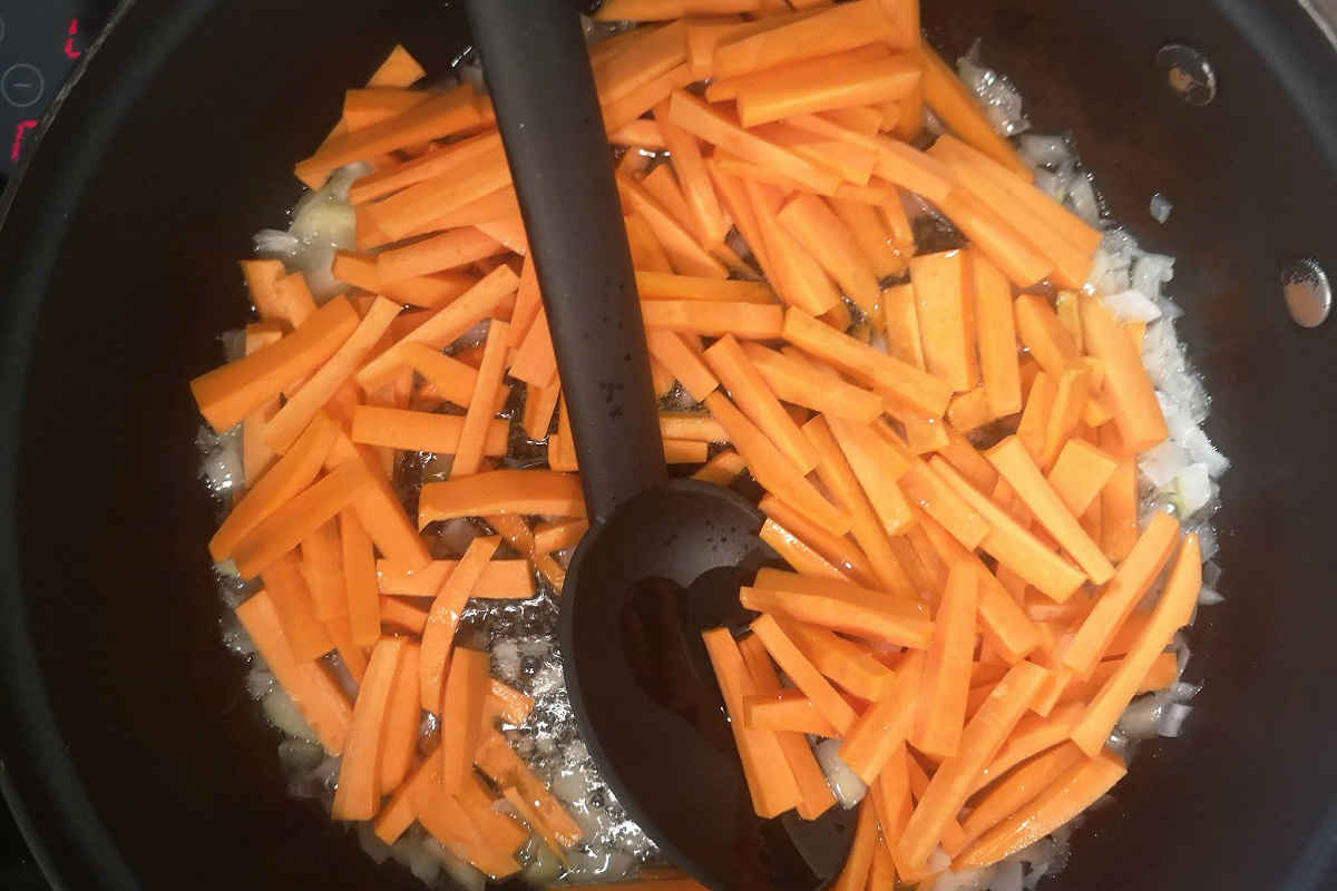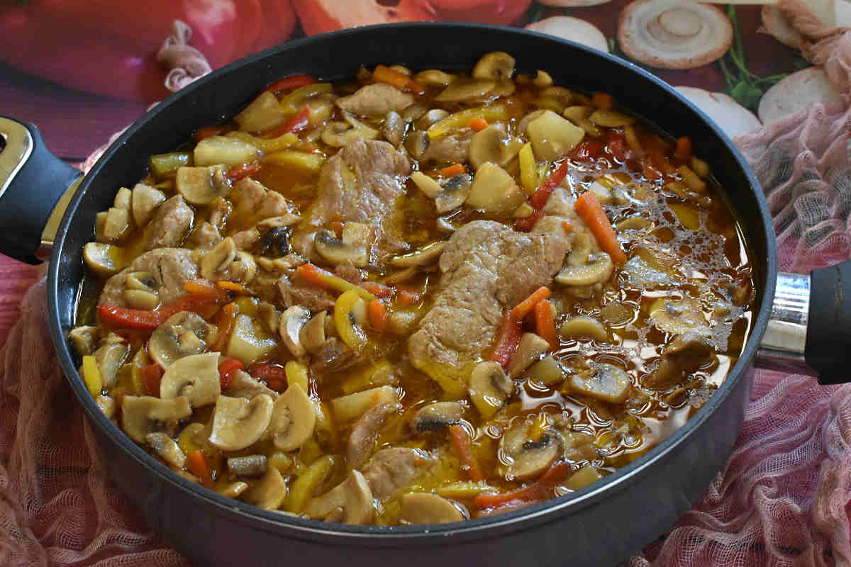2. Na tej samej patelni, podsmaż obraną i pokrojoną w kostkę cebulę i marchewkę, pokrojoną w cienkie paski. Gdy cebula się zeszkli, dodaj pokrojone w plasterki pieczarki i pokrojoną w paski paprykę. Dopraw do smaku solą, pieprzem i wymieszaj. Na koniec dodaj pokrojonego w kostkę ananasa. Przełóż wszystko do garnka z mięsem.