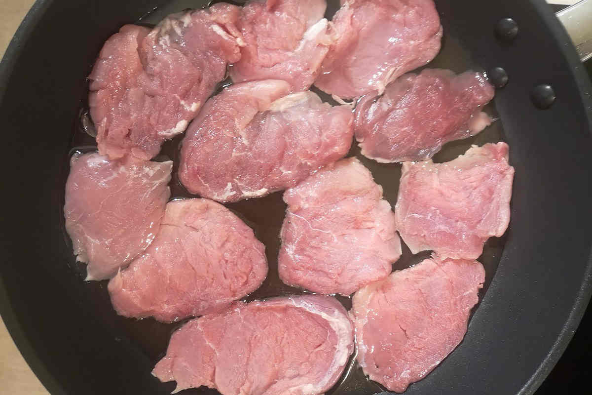 1. Mięso umyj, oczyść, osusz ręcznikiem papierowym i pokrój w dużą kostkę. Potem, podsmaż je na rozgrzanej patelni z olejem na złoty kolor z każdej strony, doprawiając do smaku solą i pieprzem. Gotowe mięso po usmażeniu, przełóż do garnka.