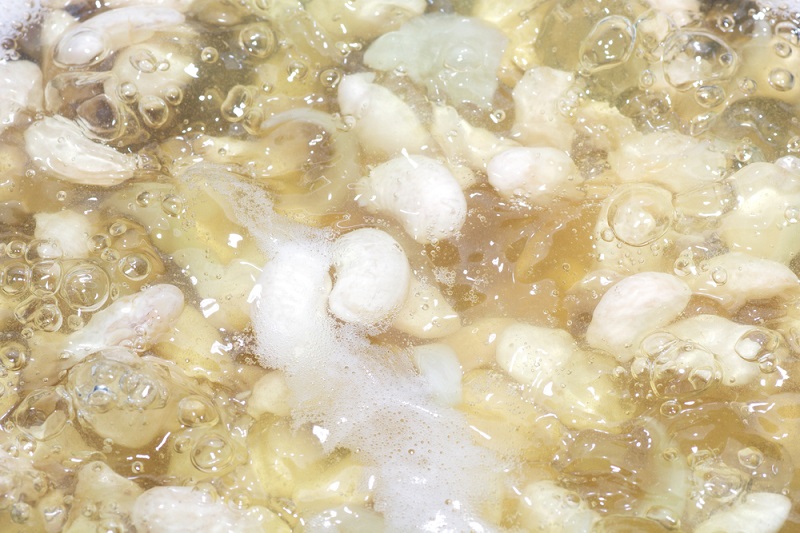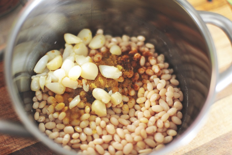 Na początku namocz fasole w zimnej wodzie przez cała noc, a przynajmniej przez 8 godzin, a następnie wylej wodę i opłucz nasiona. Zalewamy ponownie zimną wodą i podgrzewamy na średnim ogniu. Gdy woda się zagotuje odlej ją i płucz fasole na durszlaku zimną wodą. Ponownie zalej fasolę zimną, czystą woda i gotuj przez 15 minut i odlej po raz ostatni wodę. Opłucz wodą i gotują do momentu, aż fasola będzie miękka.