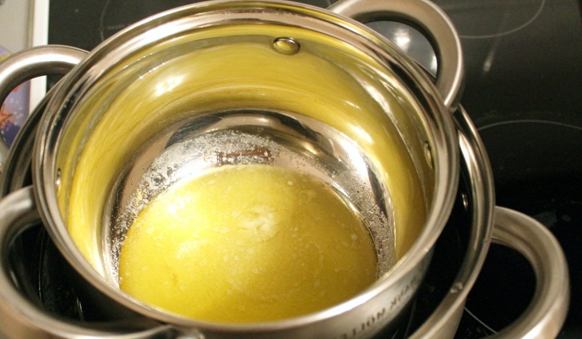 Rozpuszczamy masło w garnku (na małym ogniu, aby masło się rozpuściło, ale nie zaczęło gotować). Gdy masło uzyska płynną konsystencję, dodajemy miód i mieszamy do uzyskania jednolitej konsystencji (na małym ogniu).