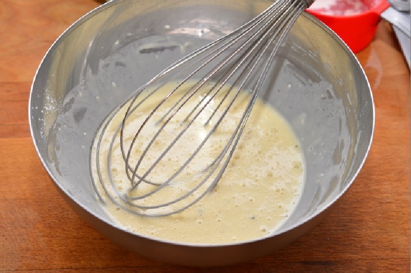 2. Zrób ciasto. Roztrzep trzepaczką jajko z mąką i piwem. Dodaj soli i pieprzu do smaku. Dzięki piwu uzyskuje się złotą i chrupiącą skórkę.