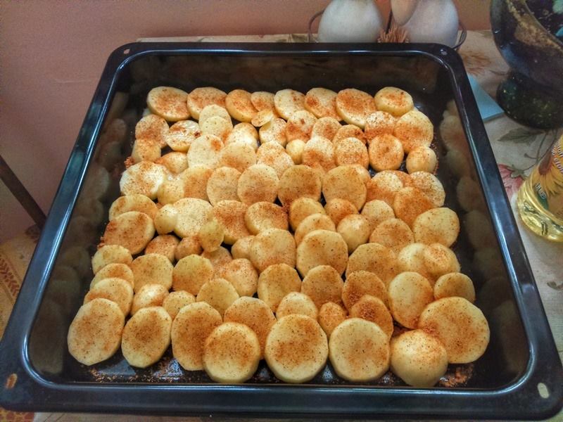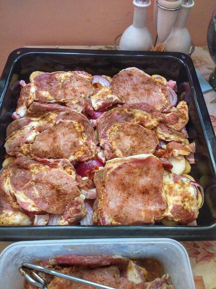 Resztę wykorzystujemy do zamarynowania mięsa – karkówkę kroimy w plastry. Ziemniaki układamy na blaszce do pieczenia.
