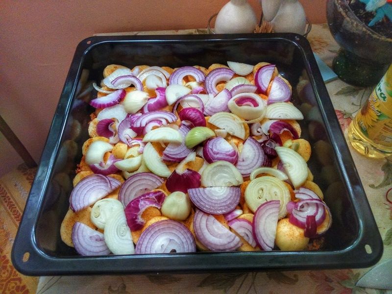 Białą i czerwoną cebulę obieramy, a następnie kroimy w plastry. Rozkładamy na ziemniakach. Bekon kroimy w kostkę i również kładziemy na ziemniakach i cebuli.