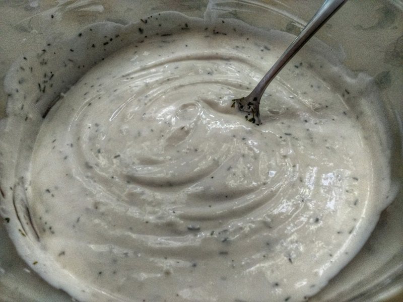 Teraz możemy zabrać się za przygotowanie sosu czosnkowego. Ząbki czosnku obieramy i przeciskamy przez praskę. Natkę pietruszki siekamy. Wszystko dodajemy do śmietany i mieszamy. Przyprawiamy według swojego gustu.