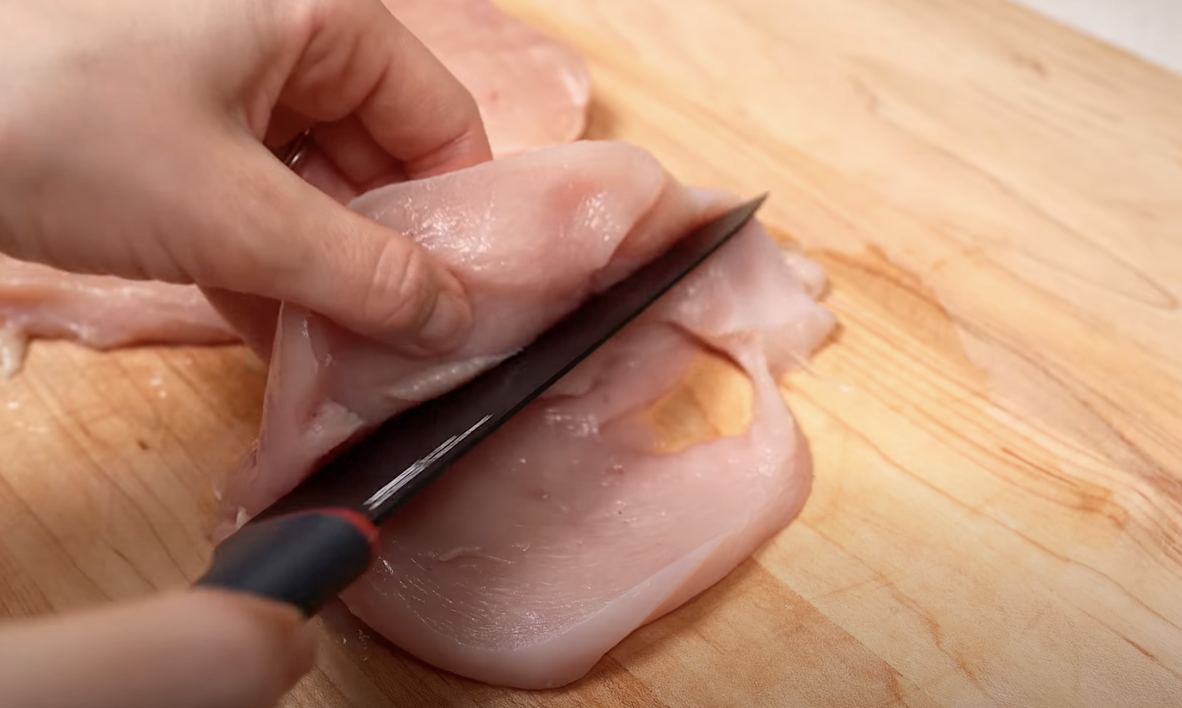 1.Oczyść , umyj oraz ręcznikiem papierowym osusz fileta z kurczaka. Następnie wszerz je natnij ( do końca go nie przecinaj).
