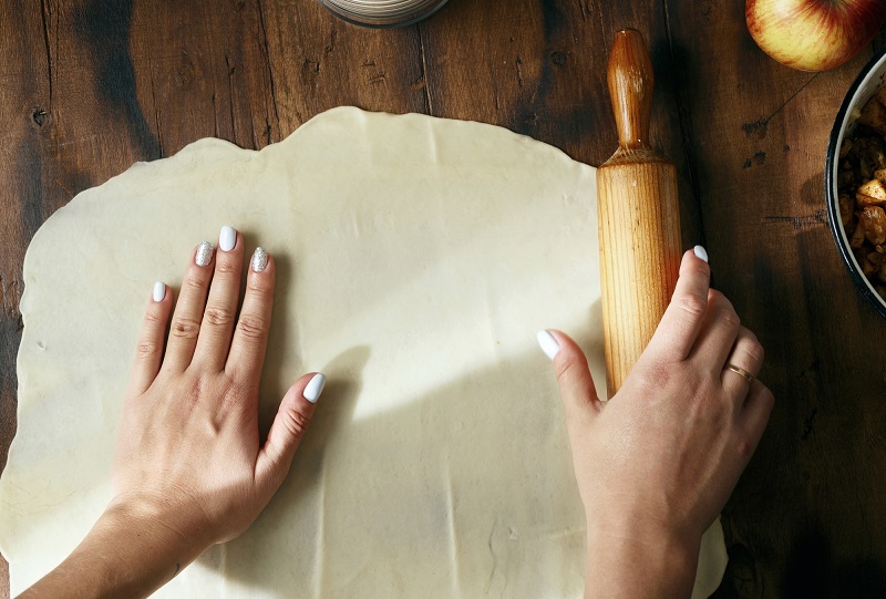 4.W miedzy czasie możesz rozwałkować ciasto, następnie pokroić je na kwadraty, aby ich wymiary wynosiły 15 x 15 cm. Na dno kieszonki połóż dodatkowy mniejszy kawałek ciasta.