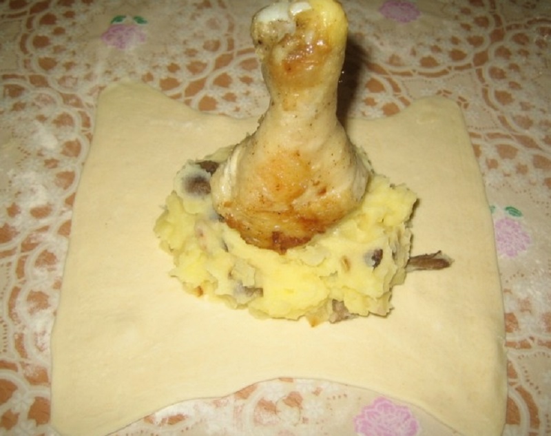 5.Na środek przygotowanego ciasta połóż gotowe purre z dodatkiem pieczarek, następnie postaw na nim kurczaka ( tak jak na zdjęciu poniżej). Resztę ciasta owiń dokładnie w ogół kurczaka , następnie zwiąż lekko nitką, tak aby nie było za szczelnie.