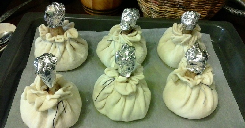 6.Papierem do pieczenia wyłóż dokładnie blachę , na której układaj ostrożnie przygotowane kiszonki. Używając foli aluminiowej owiń dokładnie część kurczaka która wystaje.