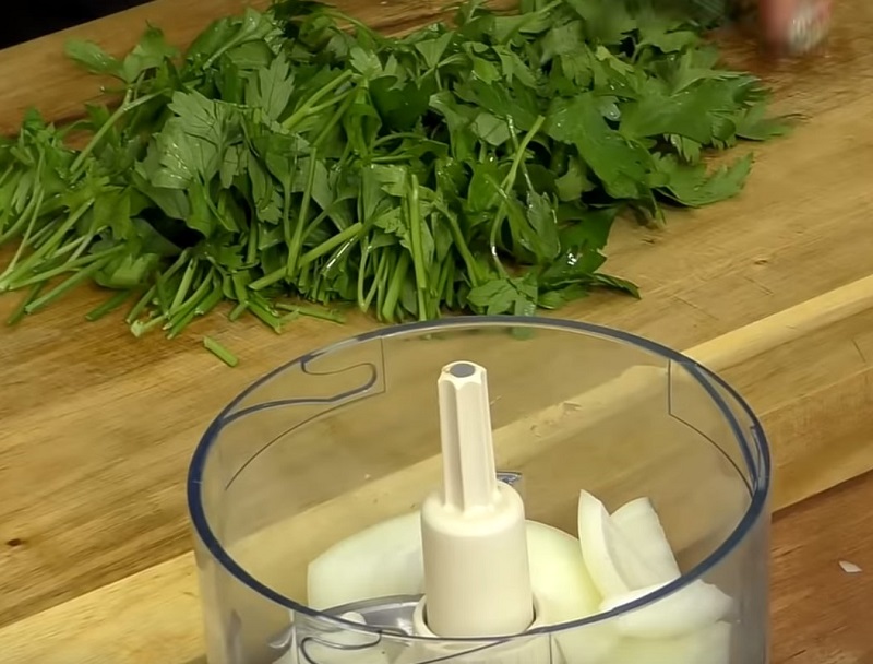 3.Do miseczki wlej wodę i zanurz w niej chleb, ale bez skórki, następnie odciśnij z niego nadmiar wody. W blenderze zmiel natkę pietruszki oraz cebulkę.