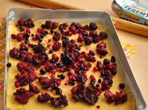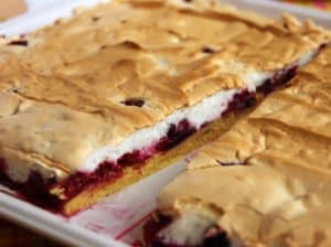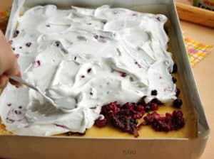 4.Używając miksera ubij białka oraz cukier na sztywno. Mieszając dalej powoli dodawać mąkę ziemniaczaną. Na wyłożone ciasto połóż ulubione owoce, następnie zakryj je gotową pianą. Piecz w rozgrzanym piekarniku przez 40 minut.