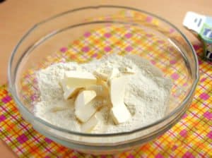 1.Do miski wsyp 200 g mąki. Następnie dodaj do niej pokrojone masło. Połącz ze sobą te składniki, aż powstanie kruche ciasto.