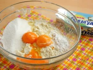 2.Dodaj również ubite wcześniej białka, cukier, proszek do pieczenia oraz resztę mąki. Z otrzymanych składników ugniataj mocno rękoma ciasto, aż będzie jednolita masa.