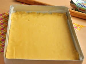 3.Potrzebna będzie forma o wymiarach 25×30 cm. Na przygotowaną formę wyłóż papier do pieczenia. Następnie wyłóż otrzymane ciasto tak jak na zdjęciu poniżej.