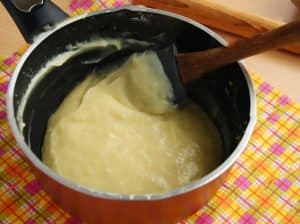 5.W garnku wymieszaj mleko z żółtkiem, cukrem, cukrem waniliowym oraz mąką. Gotuj na małym gazie do momentu ,aż konsystencja będzie przypominała budyń. Gdy gotowy budyń ostygnie dodaj do niego masło.