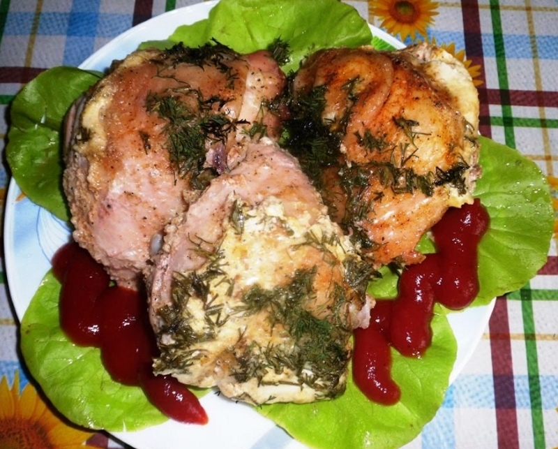 6. Pieczonego kurczaka należy podawać na gorąco. Wskazane jest dekorowanie sałatą. Zalecam dodanie powstałego po upieczeniu sosu do mięsa, aby poprawić jego smak.