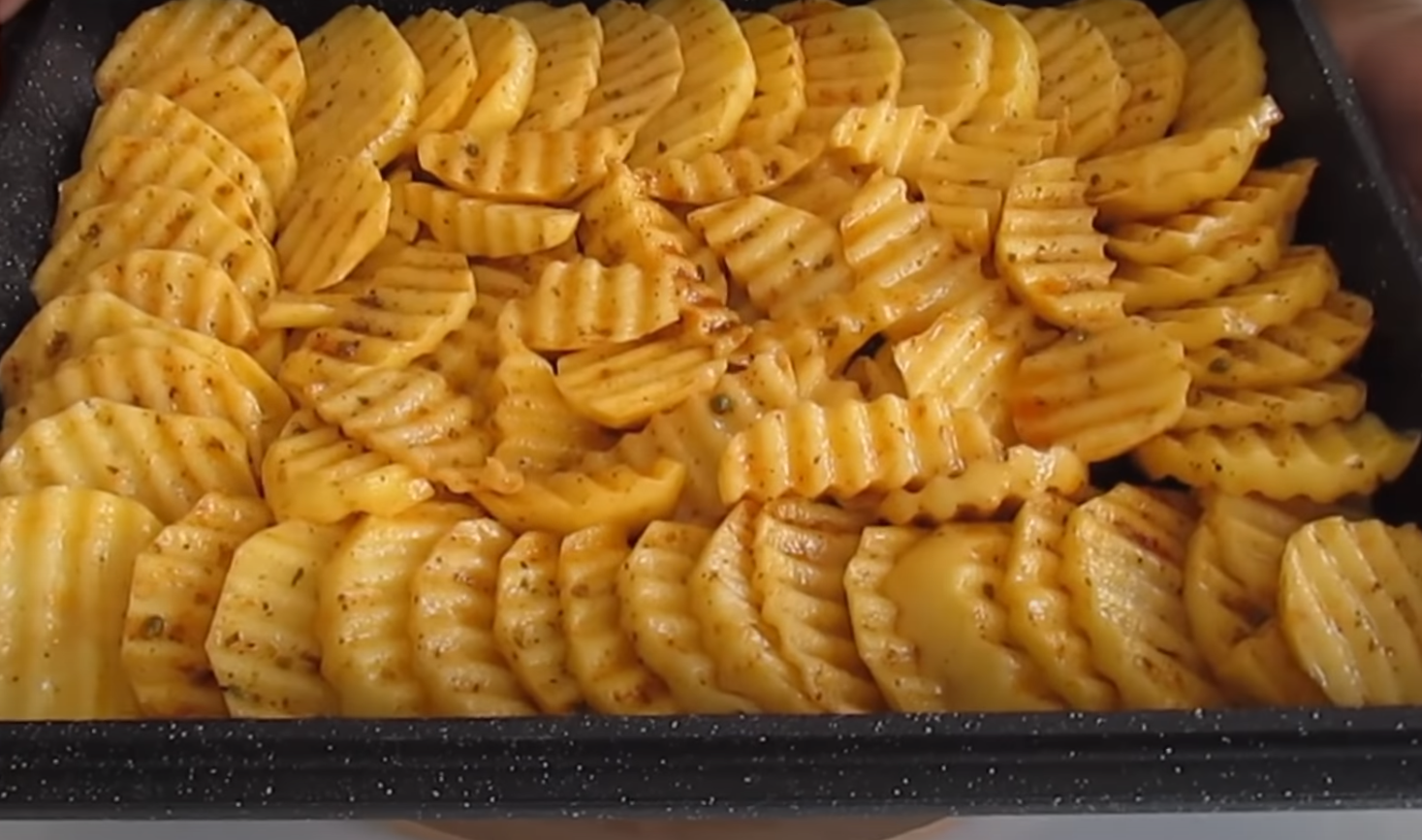 1.Dokładnie umyj i pokrój ziemniaki o grubości 0,5 cm. Przełóż je do miski, następnie polej olejem i przypraw przyprawami oraz posól i dokładnie wymieszaj. Wszystkie ziemniaki przełóż na blachę. Piecz przez 35 minut w 200 stopniach.