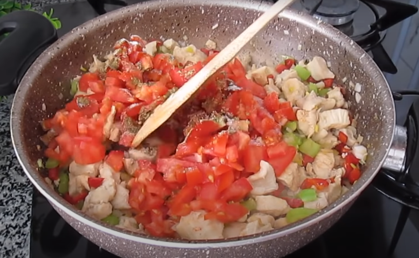 2.Cebulę umyj oraz drobno posiekaj. Papryki dokładnie oczyść, a pomidory umyj i te warzywa pokrój na małe kawałki. Na patelnie wlej odrobinę oleju w wyłóż na nią pokrojonego kurczaka. Dokładnie podsmaż mięso, następnie dodaj pomidory oraz paprykę i wszystko wymieszaj później duś na małym ogniu, aż warzywa będą miękkie.