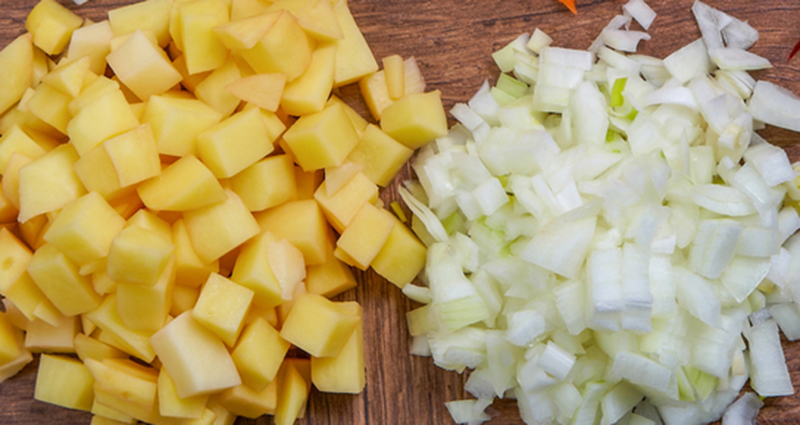 2. Pokrój ziemniaki w kostkę i dodaj do bulionu.