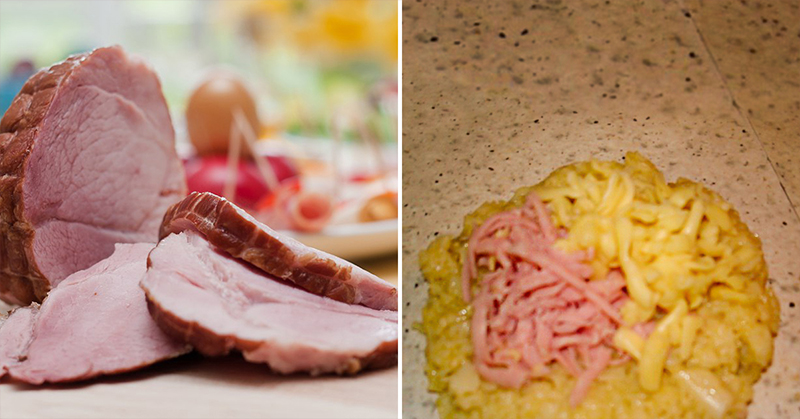 3. Uformuj z ciasta płaskie placki i połóż na nich tarty ser i szynkę. Będą naszym nadzieniem.