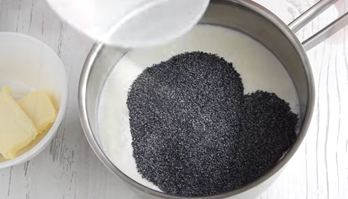 1.Do małego garnka wlej mleko, następnie wsyp mak oraz cukier, po czym dodaj również masło. Całość podgrzewaj na średnim ogniu, cały czas mieszając. Przygotowana masa powinna się lekko gotować.