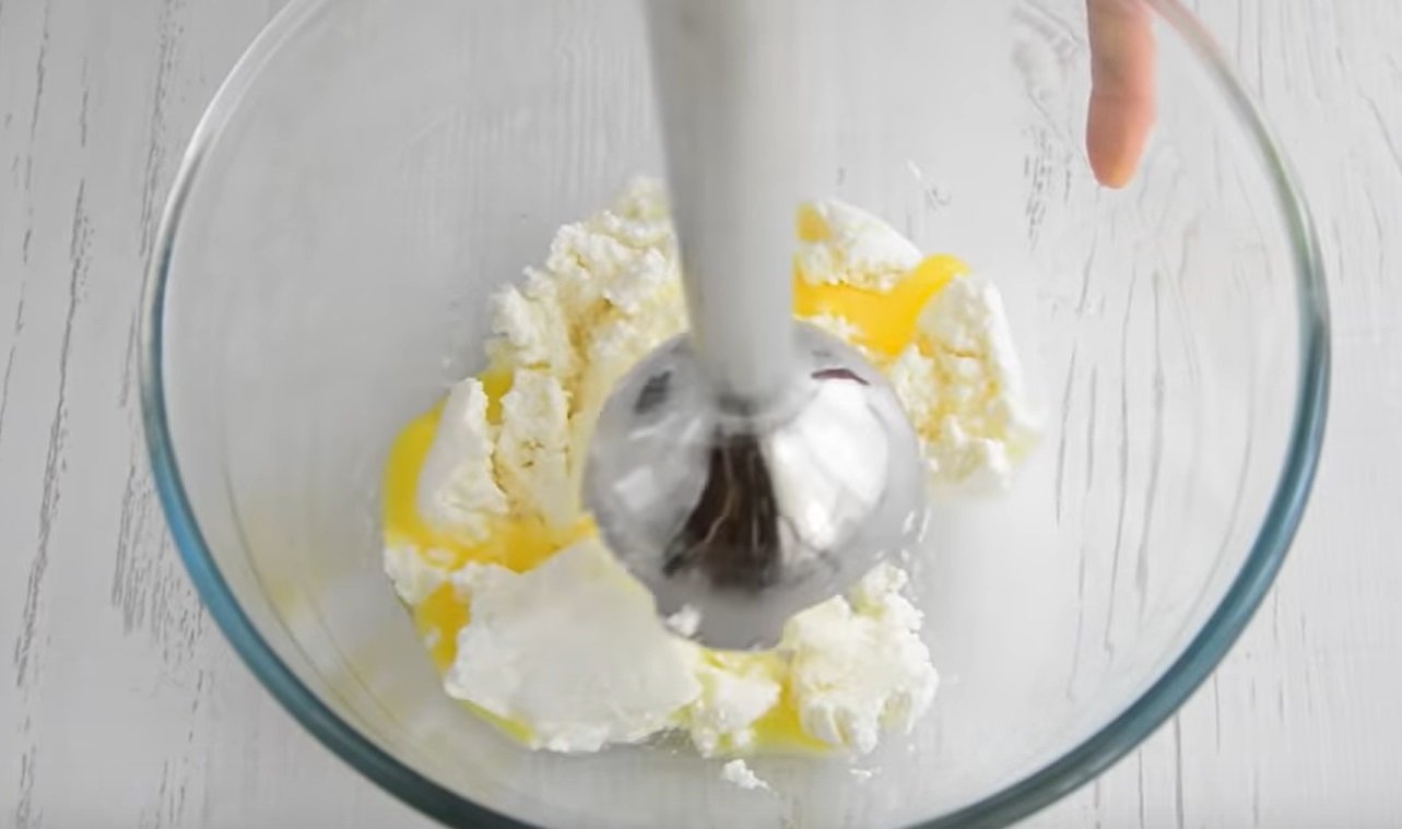 3.Do miski włóż twaróg, następnie dodaj szczyptę soli oraz jajko. Całość mieszaj dokładnie Blenderem, aż powstanie jednolita masa.