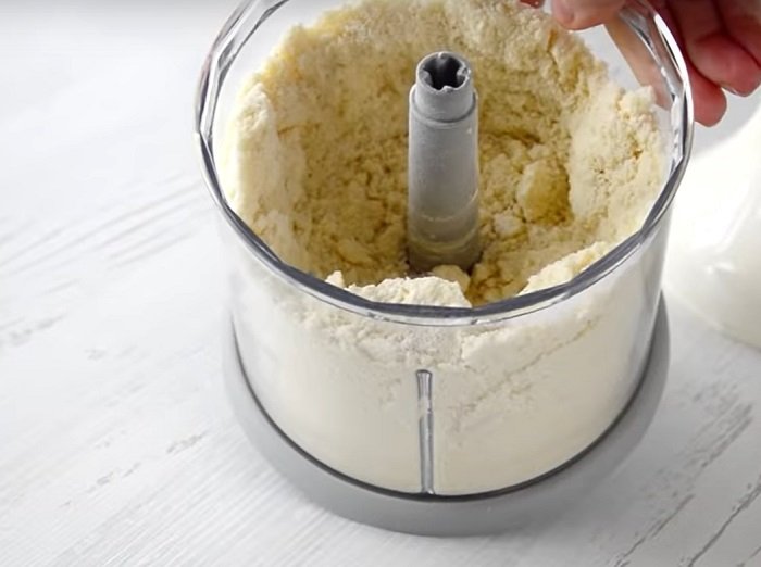 5. Pora na przygotowanie ciasta: dokładnie połącz ze sobą masło, sól, cukier oraz mąkę. Najlepiej jak być ciasto wyrabiała rękoma lub za pomocą blendera.