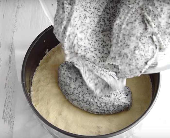 6.Dokładnie wyłóż blaszkę papierem do pieczenia. Na 2 części rozdziel ciasto, po czym jedną wyłóż dokładnie przygotowaną blaszkę , po czym wylej na nie gotową masę serowo- makową. Pozostałym ciastem posyp całą powierzchnię wylanej masy.