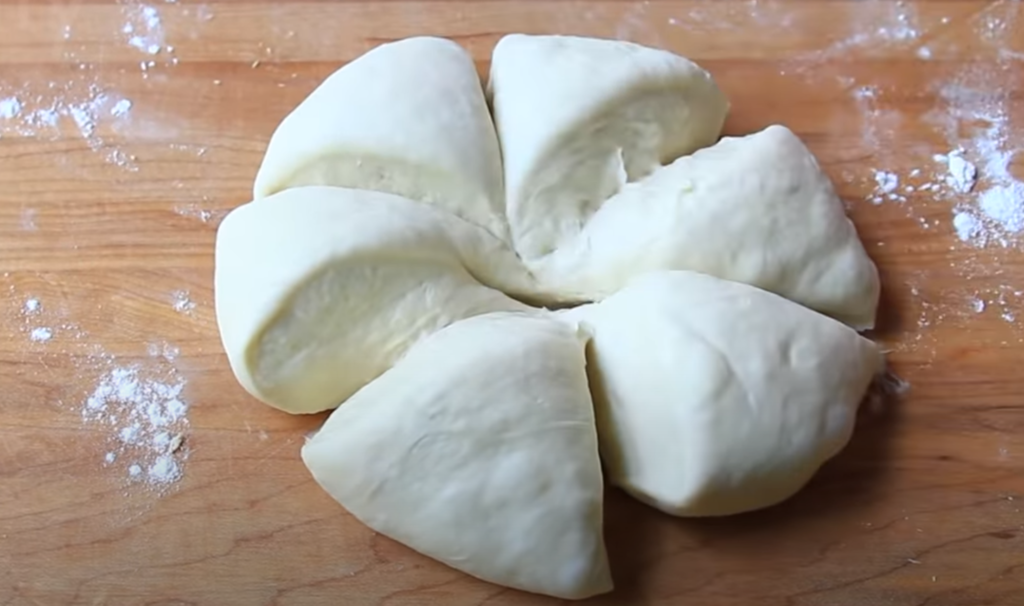 2.Gotowe ciasto odstaw na 60-90 minut. Używając mąki, oprósz przygotowany blat. Na mąkę połóż ciasto w kształcie koła, po czym podziel go na 6 kawałków.