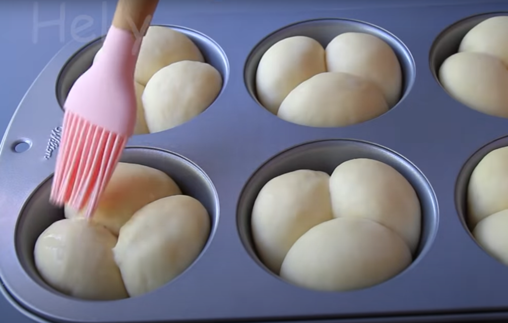 4. Staraj się , aby 3 kuleczki zmieściły się w jednym otworze (tak jak na zdjęciu powyżej). Całą blaszkę przykryj szmatką i pozostaw na kolejny kwadrans. Po tym czasie posmaruj ciasto mlekiem i piecz przez 15 minut w rozgrzanym piekarniku do 180 stopni.