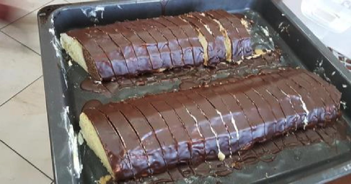 3. Tak przygotowane ciasto wlej na kolejną blachę i piecz w rozgrzanym piekarniku do 180 stopni przez 30 minut. Po upływie tego czasu, koniecznie upieczone ciasto wyjmij z blachy po czym odłóż je na bok, aby całkowicie ostygło. Na cienkie paski pokrój wystudzone ciasto (spójrz na zdjęcie poniżej).