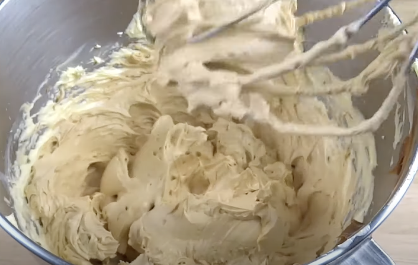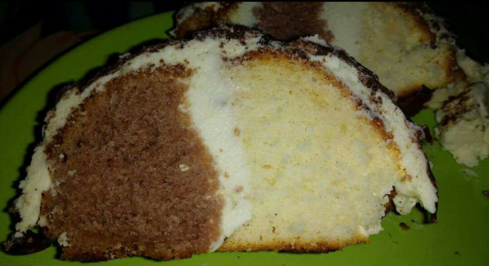 5.Ten krem tak samo się przygotowuje. Przygotowany krem na sklejać paski ciasta ciemnego oraz jasnego na przemian. Jeżeli chcesz odrobinę kremu zostaw na górę oraz na pokrycie boków.