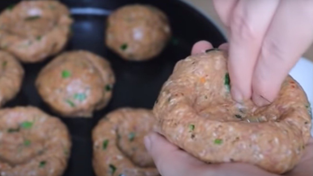 2.Olejem roślinnym wysmaruj swoje dłonie, a przygotowane mięso pokrój na mniejsze kawałki. Z pokrojonego mięsa uformuj kulkę, a potem połóż je na przygotowanej formie do pieczenia. W każdym kawałku za pomocą palców uformuj na środku rowek, wtedy powstanie potrzebne Ci ,,gniazdo”. Tak przygotowane włóż do rozgrzanego piekarnika. Piecz przez 20 minut w 180 stopniach.
