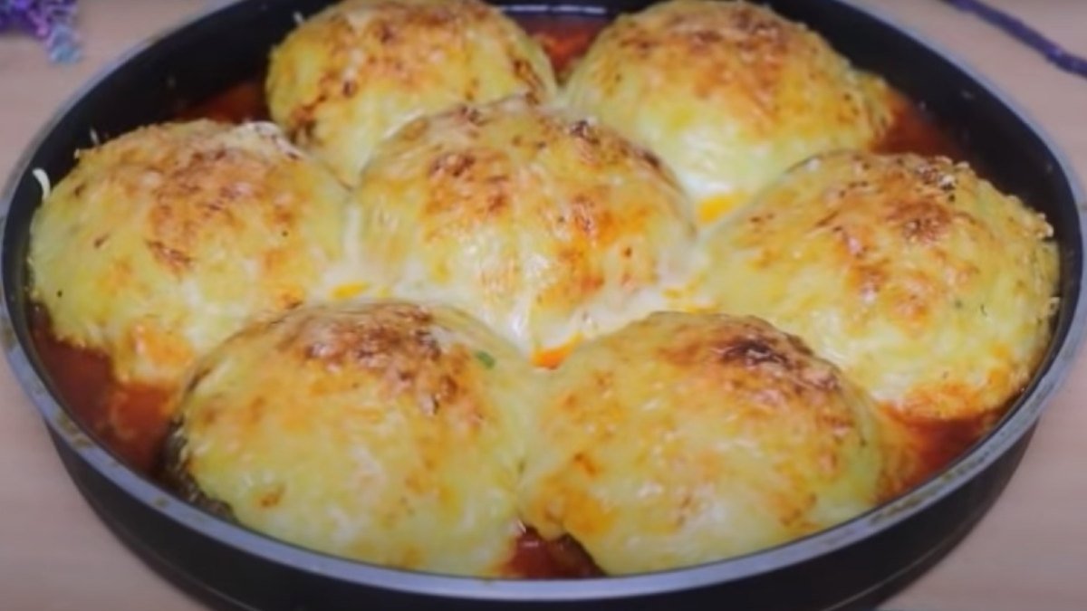 4.Przygotowanym sosem polej całe danie .Gotowym farszem ziemniaczanym możesz uzupełniać mięsne gniazda. Aby danie się dobrze upiekło używaj worka do pieczenia. Startym serem posyp wierch przygotowanych mięsnych gniazd. Do rozgrzanego piekarnika możesz wkładać przygotowane danie. Piecz przez 25 minut w 200 stopniach. Upieczone danie świetnie smakuje z posiekanym z wierchu koperkiem.